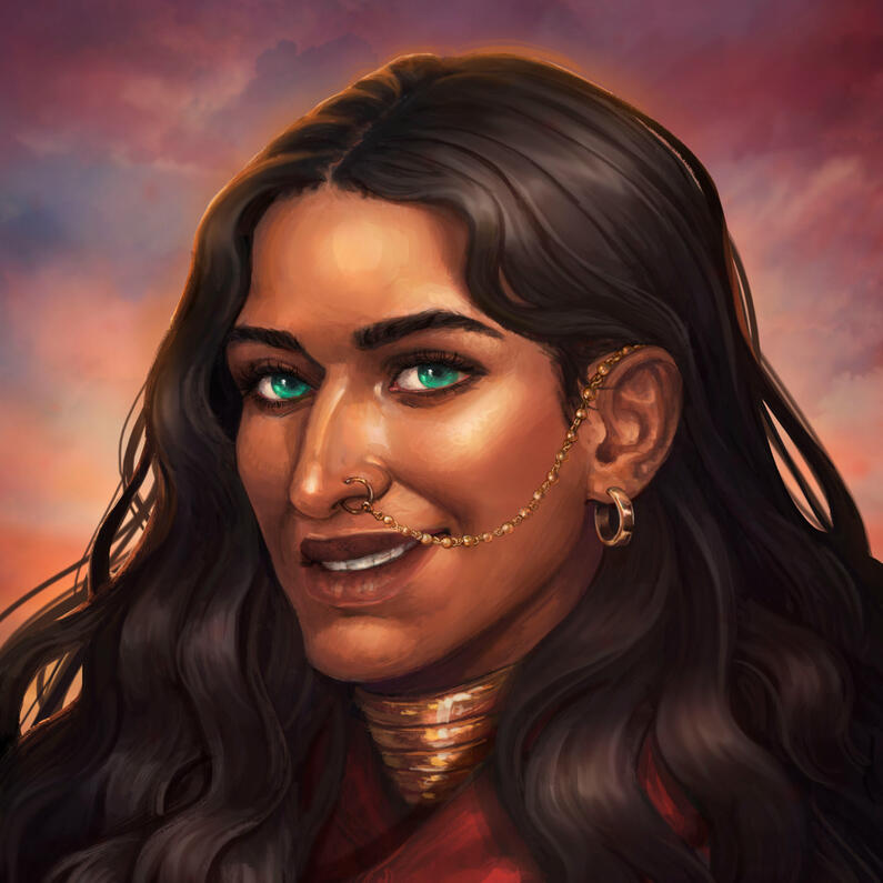 Hayat's glee is one of cheerful nature, often one to display a warm and welcoming smile upon plush lips. Though far removed from greater riches, a gilded ring sits secured in her left nostril, oftentimes seen with an attached, slim golden chain secured behind her ear, with a golden earring seated in each earlobe.